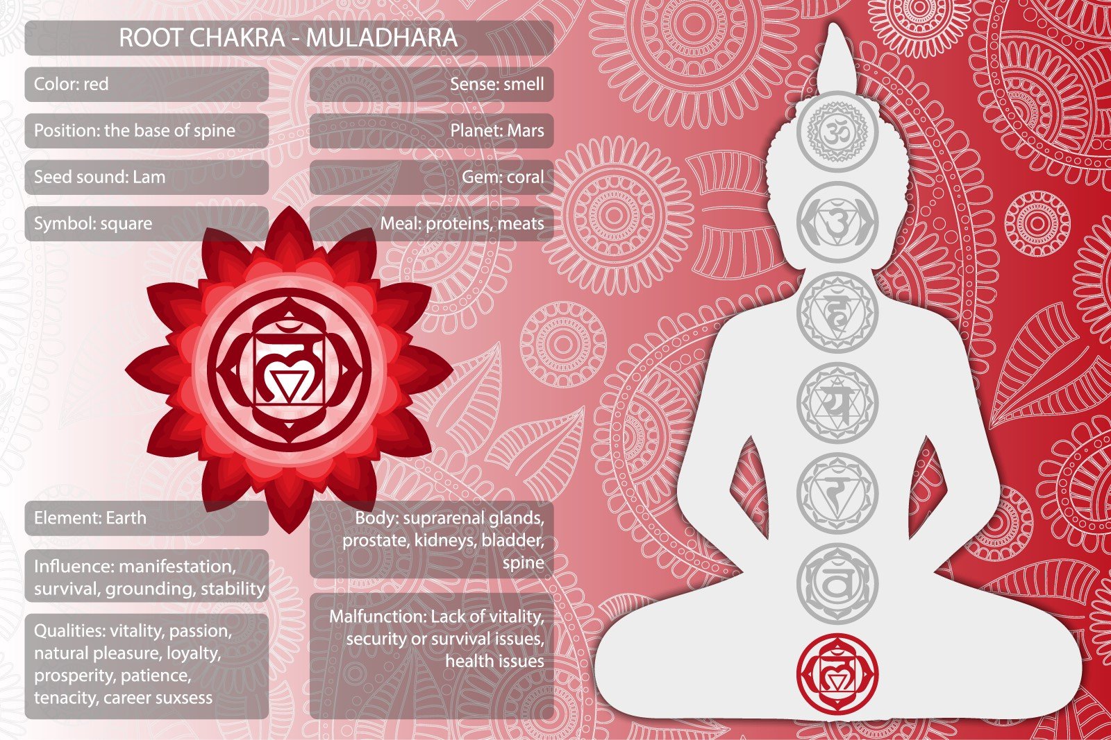To begin activating your Root Chakra, you could start wearing or incorporating the color red into your daily life. Getting into the psychology of the color red, I recommend looking here for more detailed information on red and many other colors. From www.colorsexplained.com, we understand that red is an action color; red demands attention, action, enhances physical needs, and may be dramatic and a sign of disruption or danger. Combined with the Muladhara energy of basic life needs, this color theory begins to paint a picture of our intense human needs and desires. How are you feeling about your Root Chakra and the association with the color red? Take notes, write down your thoughts and feelings as we move along!